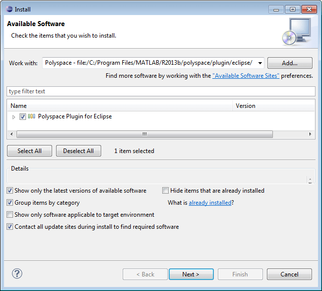 На странице Доступное программное обеспечение выберите Polyspace Plugin for Eclipse.