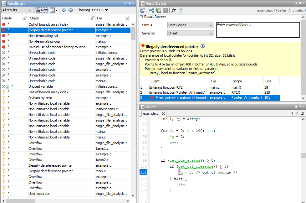 Щелкните заголовок столбца «Семейство», чтобы отсортировать результаты по степени их критичности. Отметьте в файле красный флажок «Незаконно отменить ссылку на указатель» example.c. Красная проверка показывает, что ошибка происходит на всех путях выполнения, рассмотренных в анализе.
