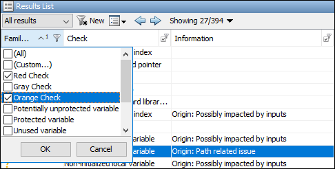 Щелкните заголовок столбца «Семейство» для сортировки проверок по цвету. Кроме того, можно отфильтровать результаты, отличные от проверки красным и оранжевым. Чтобы начать фильтрацию, щелкните