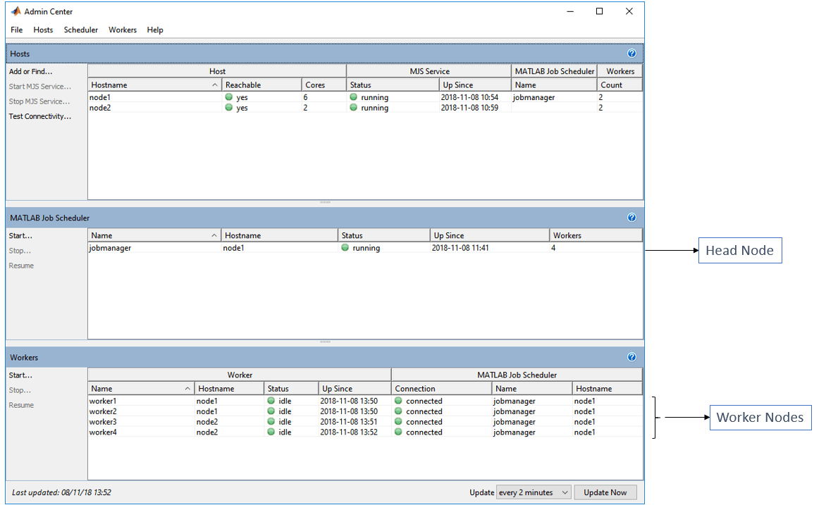 mjs Обслуживание и назначение в качестве главного узла или рабочего узлаЧтобы настроить сервер с несколькими работниками, запустите службу, которая запускает планировщик заданий ( mjs ) на компьютере, который действует как головной узел, и на всех компьютерах, которые действуют как рабочие узлы. В простейшей конфигурации один и тот же компьютер может выступать в качестве головного узла и рабочего узла.