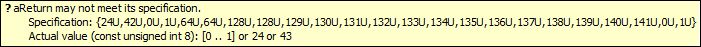 Как правило, анализ проверяет, находится ли каждый выходной аргумент выполняемого и возвращаемого значения в ограниченном диапазоне, разрешенном их типами данных AUTOSAR. Для ограничения значений типов данных AUTOSAR используются ограничения данных в файлах ARXML.