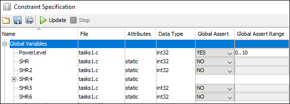 Можно наложить ограничения (также известные как спецификации диапазона данных или DRS) на диапазон глобальной переменной и проверить с помощью средства проверки кода, нарушают ли операции записи для переменной ограничение. Общие сведения о рабочем процессе см. в разделе Указание внешних ограничений.
