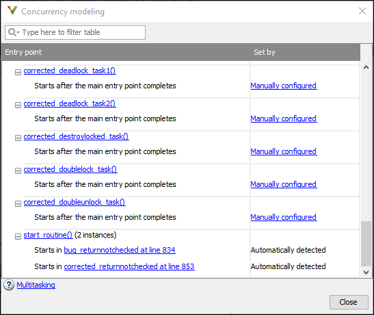 В представлении «Моделирование параллелизма» отображаются все задачи и прерывания, извлеченные при анализе из кода и многозадачной конфигурации Polyspace ®.