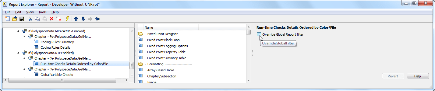 На левой панели выберите Run-time Checks Details Ordered by Color/File компонент. Этот компонент создает таблицы в отчете с подробными сведениями о проверках во время выполнения, найденными в программе Polyspace Code Prover.