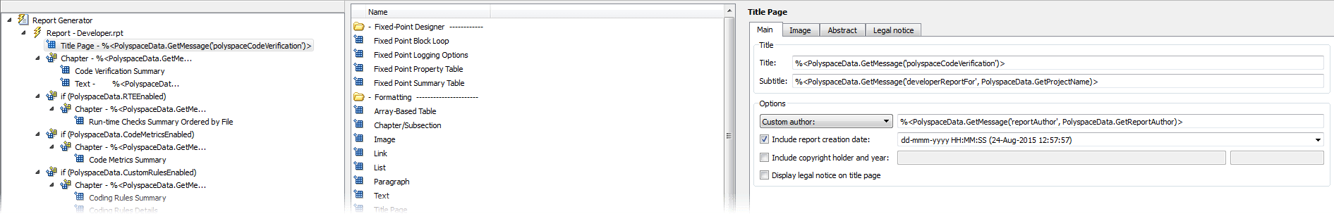 Шаблон разработчика находится в где polyspaceroot/toolbox/polyspace/psrptgen/templates является папкой установки Polyspace.polyspaceroot