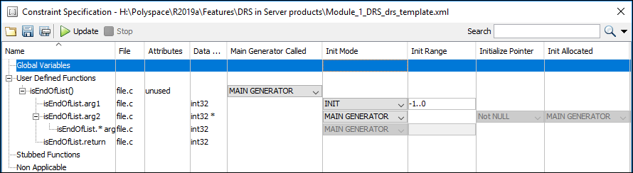 В интерфейсе пользователя настольных продуктов Polyspace можно указать ограничения в окне Спецификация ограничений (Constraint Specification). Ограничения сохраняются в XML-файле, который можно повторно использовать для других проектов.
