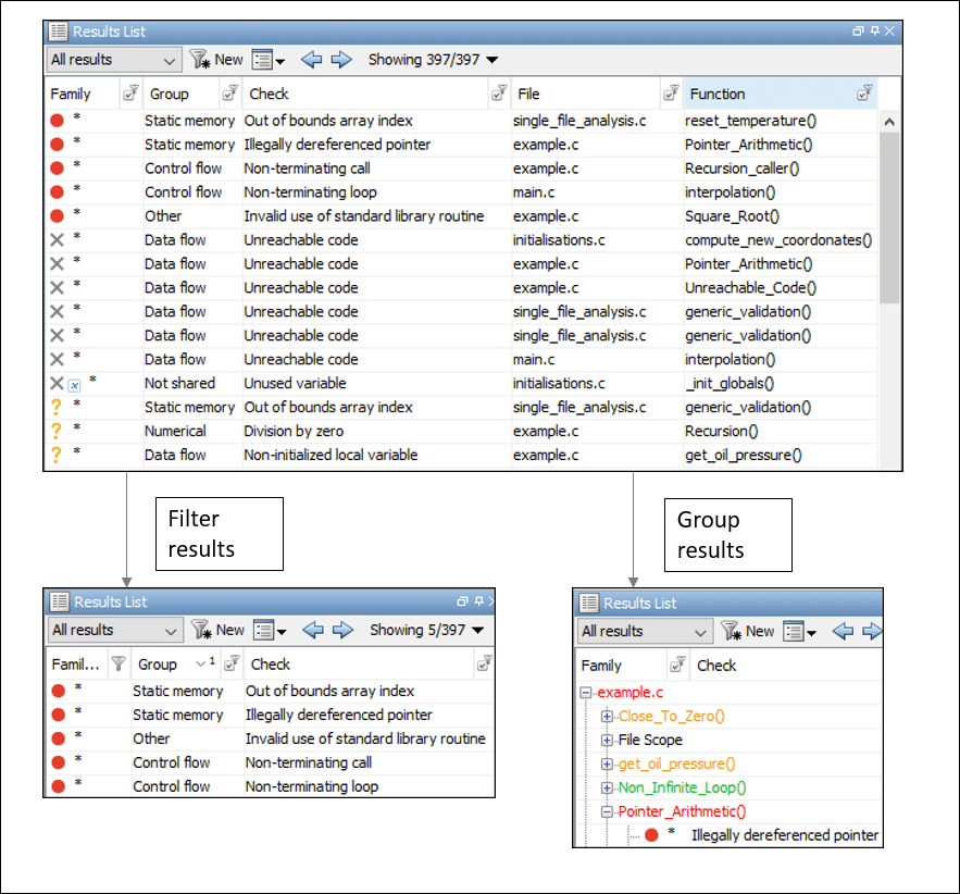 При открытии результатов анализа Polyspace ® появляется плоский список дефектов (Bug Finder), проверок времени выполнения (Code Prover), нарушений правил кодирования или других результатов. Для организации проверки можно сузить список или сгруппировать результаты по типу файла или результата.