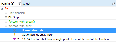В программе проверки кода имя файла или функции показывает наихудший цвет проверки в файле или функции. Серьезность цвета чека уменьшается в порядке: красный, серый, оранжевый, зеленый.