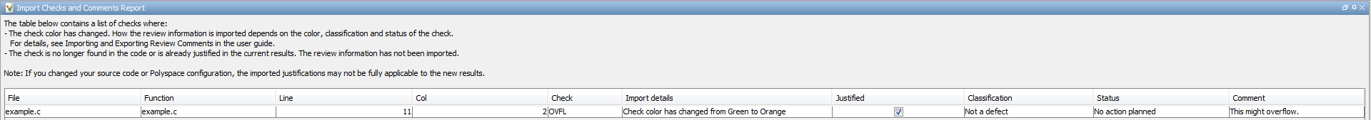 Если для одной и той же проверки уже введены другие сведения о проверке, Polyspace подсвечивает только изменения в отчете Импорт проверок и комментариев. Он не импортирует информацию проверки из предыдущего результата.