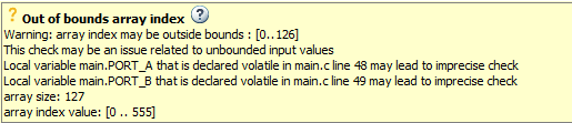 В этом примере в сообщении указывается размер массива (127), границы массива (0.. 126) и диапазон значений, которые переменная индекса массива может принимать в этот момент в коде (0.. 555).