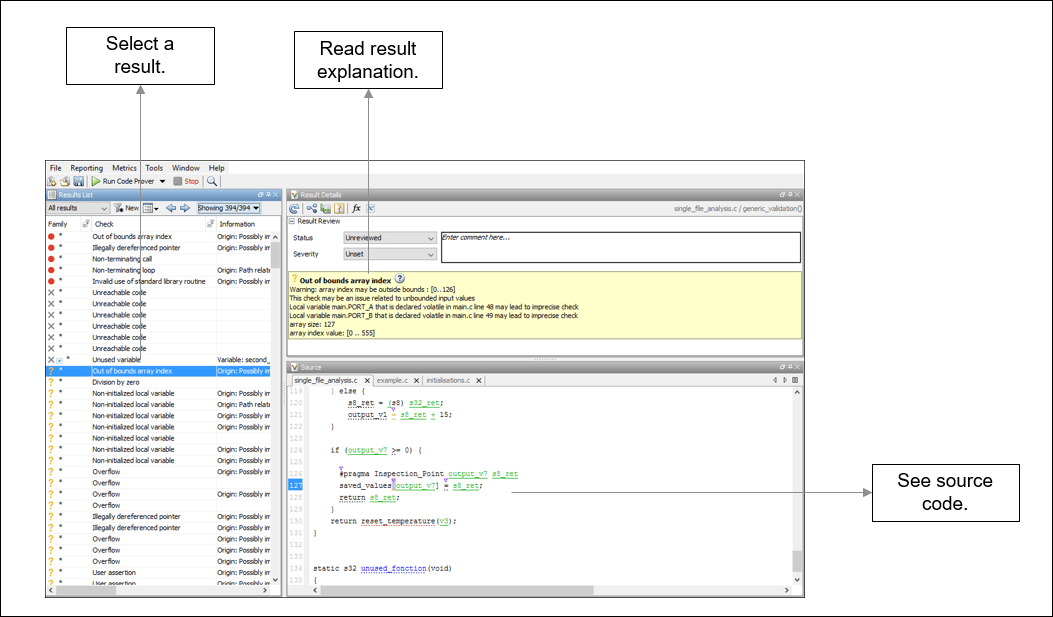 См. также раздел Фильтрация и группирование результатов в пользовательском интерфейсе Polyspace Desktop. После сужения списка можно начать просмотр отдельных результатов. В этом разделе описывается, как просмотреть результат.