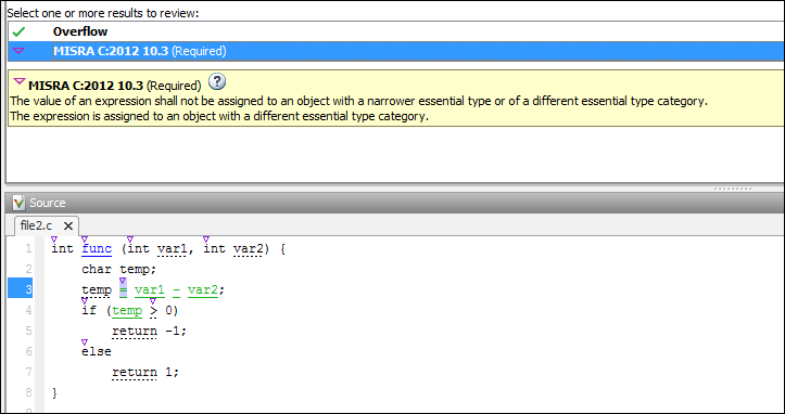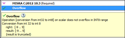 Запустите программу проверки кода для этого кода. На панели «Источник» нажмите кнопку = в temp = var1 - var2;. Вы видите ожидаемое нарушение MISRA C:2012 правила 10.3, но также зеленую проверку переполнения.