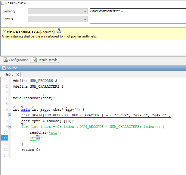Запустите программу проверки кода для этого кода. На панели «Источник» нажмите кнопку ++ в ptr++. Вы видите ожидаемое нарушение правила 17.4 MISRA C:2004.