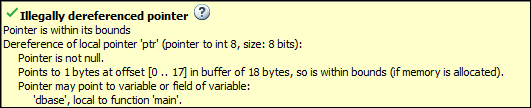 Рассмотрим обоснование этого правила. После приращения указатель может выйти за пределы допустимого буфера (например, массива) или даже указать на произвольное местоположение. Арифметика указателя является точной до тех пор, пока указатель указывает в разрешенном буфере. Это нарушение правила можно обосновать с помощью результатов проверки кода. Illegally dereferenced pointer проверка.