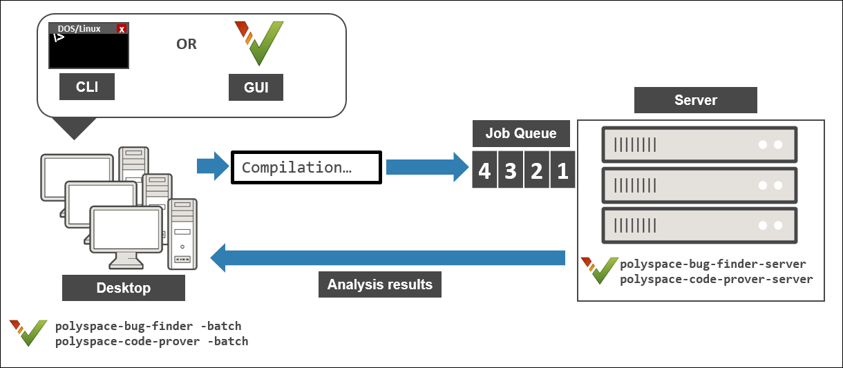 Анализ выполняется локально на рабочем столе до конца этапа компиляции. После компиляции программа отправляет задание анализа в кластер и предоставляет идентификатор задания. Также можно прочитать идентификатор из файла ID.txt в папке результатов. Для мониторинга анализа используйте polyspace-jobs-manager с идентификатором задания.