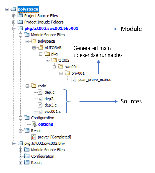 Используя информацию в AUTOSAR XML, Polyspace for AUTOSAR создает проект с отдельным модулем для каждого компонента программного обеспечения. В одном модуле Polyspace собирает исходный код (.c и .h файлы), содержащие реализацию всех исполняемых таблиц в программном компоненте и генерирующие любые дополнительные заголовочные файлы, необходимые для реализации.