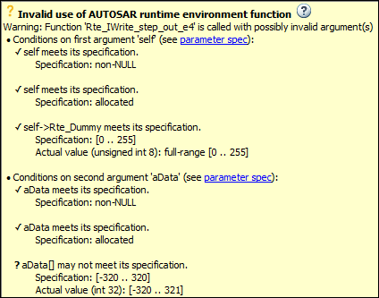 Проверки на наличие несоответствий в анализе Polyspace могут показывать результаты, подобные этому. Здесь второй аргумент в вызове RTE_IWrite_step_out_e4 нарушает ограничения данных в спецификациях ARXML.