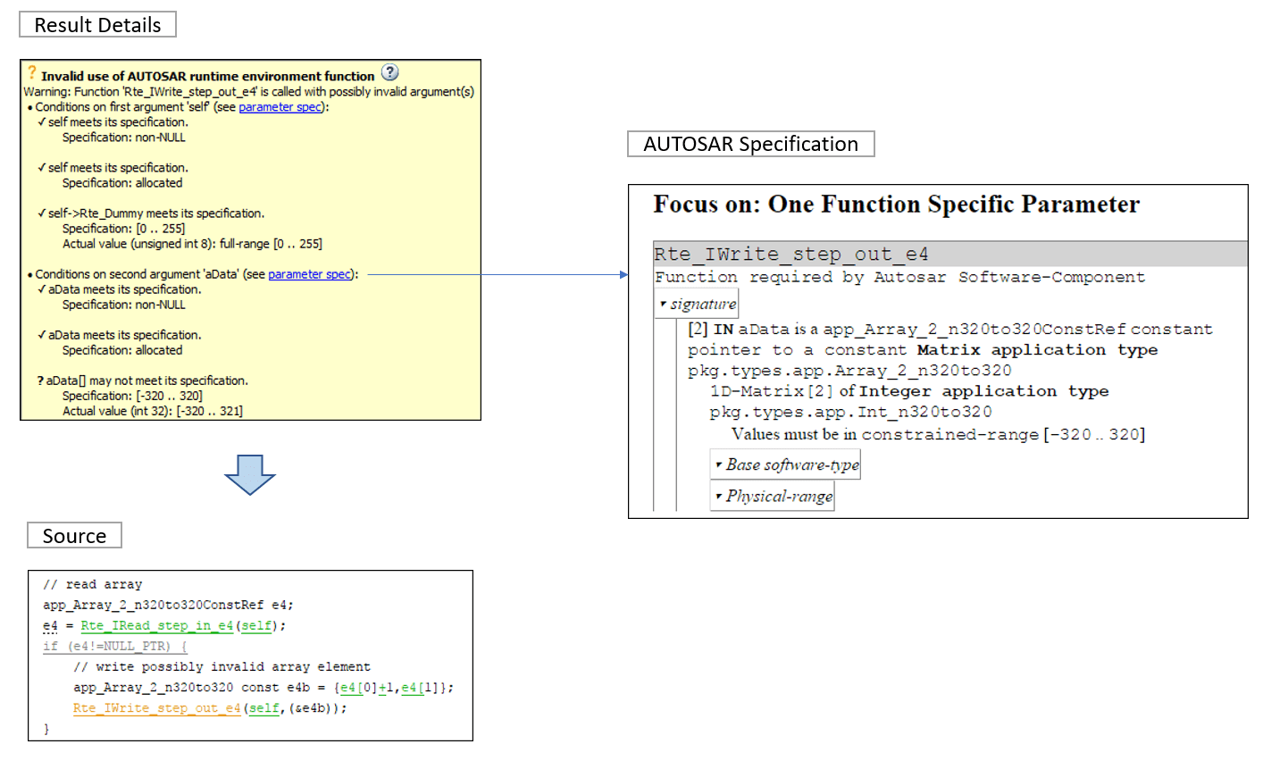 Для возвращаемого значения и каждого аргумента отображаются фактические возможные значения во время выполнения и значения, разрешенные типом данных в спецификации ARXML. Сравните их и найдите недопустимое значение.