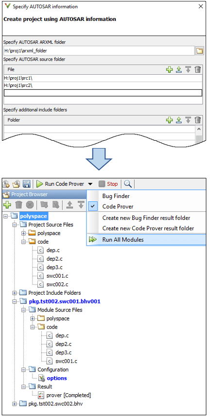 В интерфейсе пользователя анализ выполняется в два этапа: создание проекта Polyspace из ARXML и папок кода и запуск программы проверки кода в проекте.