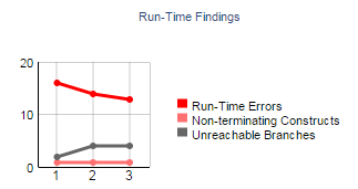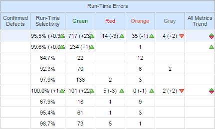 На каждой вкладке появляются новые столбцы, а существующие столбцы отображают улучшение или регрессию в метрике. Например, на рисунке ниже отображается новый столбец «Все показатели тренда», который отображается на вкладке «Сводка». В этом столбце описывается сравнение метрик в группе Ошибки времени выполнения (Run-Time Errors) в двух версиях проекта. Количество красных чеков уменьшилось на 3, а количество серых чеков увеличилось на 2. Поскольку уменьшение красных чеков является улучшением, а увеличение серых чеков является регрессией, вы видите: