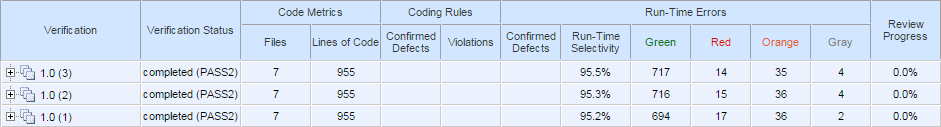 Показатели качества кода для всех версий проекта отображаются на вкладках Сводка (Summary), Метрика кода (Code Metrics), Правила кодирования (Coding Rules) и Проверки времени выполнения (Run-Time Checks). Например, на рисунке показана вкладка «Сводка», на которой показаны три версии проекта.