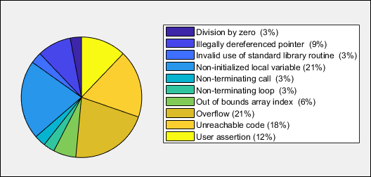 При выполнении сценария отображается распределение чеков по типу чека. Сценарий также создает HTML-отчет, содержащий график и таблицу проверок Polyspace.
