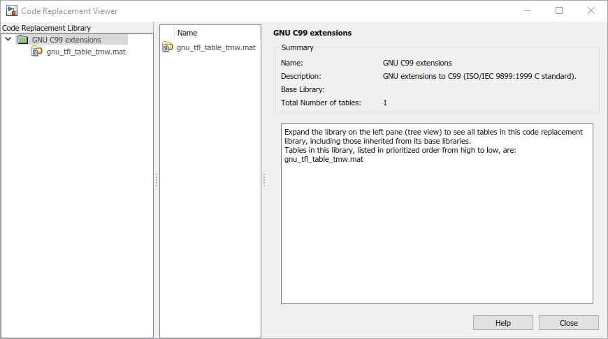 Если при открытии программы просмотра указывается имя библиотеки, программа просмотра отображает таблицы замены кода для этой библиотеки. Если при открытии программы просмотра указывается имя таблицы, программа просмотра отображает записи замены функции и кода оператора для этой таблицы. Средство просмотра может отображать только определенные таблицы замены кода. Дополнительные сведения о создании таблиц замены кода см. в разделе Определение оптимизации библиотеки замены кода (встроенный кодер).