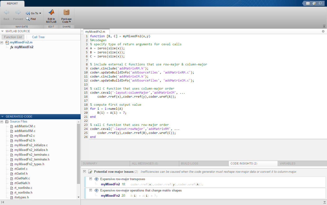 cfg = coder.config('lib'); cfg.HighlightPotentialRowMajorIssues = true; codegen myMixedFn2 -args {ones(20,10),ones(20,10)} -config cfg -launchreport -rowmajor