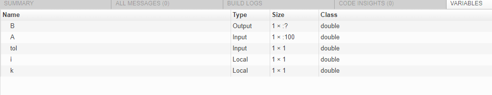 codegen -report myuniquetol -args {coder.typeof(0,[1 100],1),coder.typeof(0)}