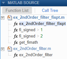 При преобразовании кода MATLAB с плавающей запятой в код MATLAB с фиксированной запятой и последующем создании кода C/C + + с фиксированной запятой на панели «Источник MATLAB» отображаются исходные функции MATLAB и функции MATLAB с фиксированной запятой. Например: