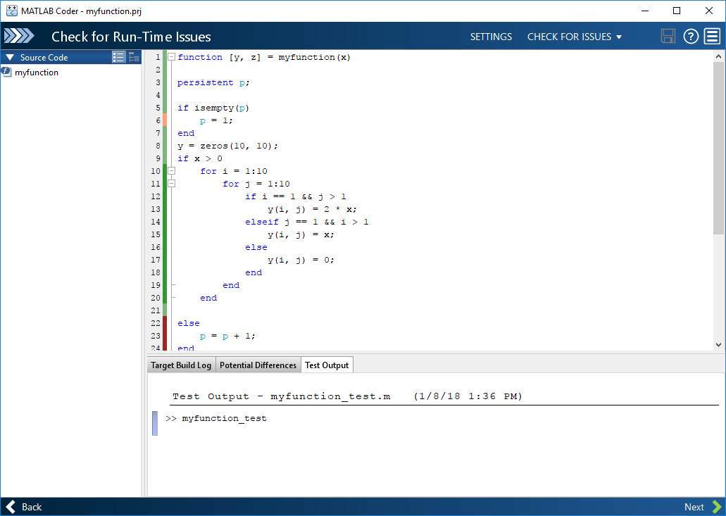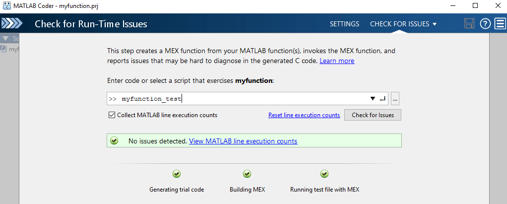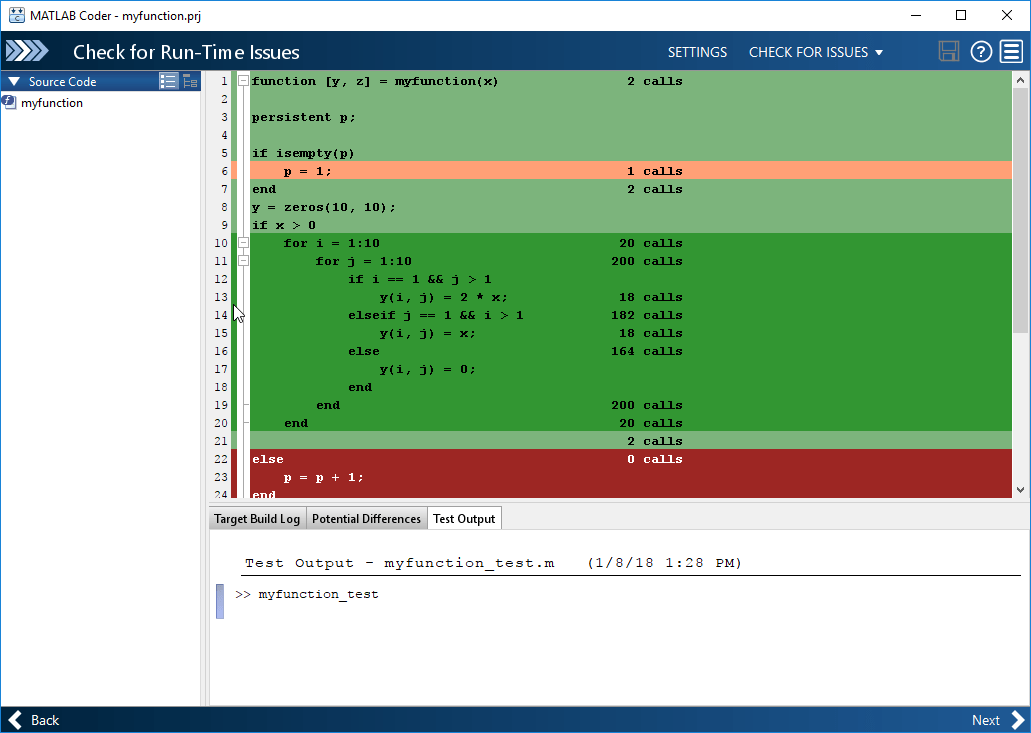 При выполнении шага Проверка ошибок времени выполнения в приложении MATLAB ® Coder™ необходимо выполнить тест, вызывающий функции начального уровня с репрезентативными данными. На шаге Проверка ошибок времени выполнения создается функция MEX из функций MATLAB и выполняется тест, заменяющий вызовы функций MATLAB вызовами функции MEX. При выполнении функции MEX приложение подсчитывает выполнение кода MEX, соответствующего строке кода MATLAB. Эти счетчики выполнения строк помогают определить, насколько хорошо тест выполняет код MATLAB. Можно определить мертвый код и разделы кода, которые требуют дальнейшего тестирования.
