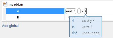 Чтобы указать, что второй размер является переменным размером с верхней границей 4, выберите :4. Кроме того, чтобы указать, что второй размер является неограниченным, выберите :Inf.