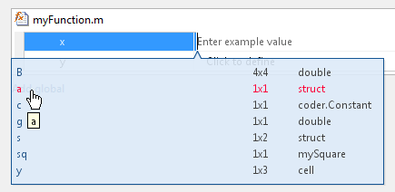Тип входного параметра: struct(1x1). Тип поля a является double(1x1). Тип поля b является char(1x1)