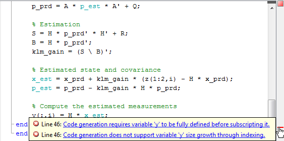 Перед созданием кода из кода MATLAB необходимо исправить ошибки, обнаруженные анализатором кода.