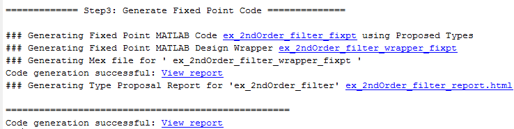 codegen анализирует код с плавающей запятой. Поскольку вы не указали типы ввода для ex_2ndOrder_filter функция, процесс преобразования определяет типы путем моделирования тестового файла. Затем процесс преобразования выводит диапазоны для переменных в алгоритме. Эти производные диапазоны используются для предложения типов с фиксированной точкой для этих переменных. После завершения преобразования создается отчет по предложениям типа.