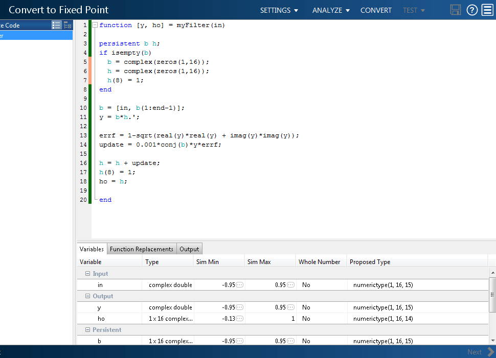 Приложение преобразует myFilter.m для фиксированной точки и предлагает типы данных с фиксированной точкой с использованием новой длины слова по умолчанию.