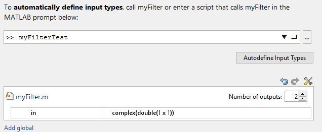 На странице Определить типы ввода (Define Input Types), чтобы добавить myFilterTest в качестве тестового файла перейдите к myFilterTest.mи нажмите кнопку Открыть.