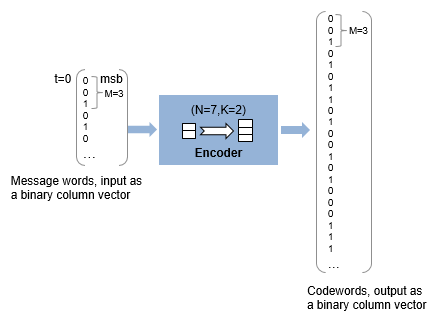 Каждое входное слово сообщения является двоичным вектором длиной 6, который представляет 2 трёхразрядных целых числа. Каждое соответствующее выходное кодовое слово является двоичным вектором длиной 21, который представляет 7 трехбитовых целых чисел. Дополнительные сведения см. в разделе Длина входного и выходного сигнала в блоках RS.