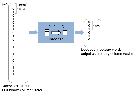 На этом рисунке показана длина слова ввода-вывода декодера для длины кодового слова N = 7 и длины слова сообщения K = 2. Поскольку N = 2M-1, когда N = 7, длина символа M = 3.