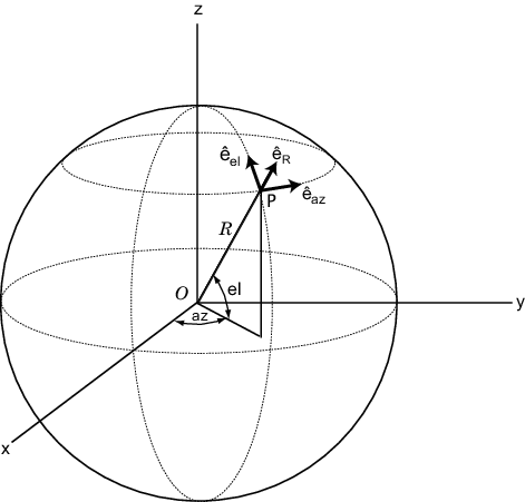 Сферический базис представляет собой набор из трех взаимно ортогональных единичных векторов (e ^ az, e ^ el, e ^ R), определенных в точке сферы. Первый единичный вектор указывает вдоль линий азимута на постоянном радиусе и отметке. Вторые точки по линиям отметки при постоянных азимуте и радиусе. Оба являются касательными к поверхности сферы. Третий единичный вектор указывает радиально наружу.