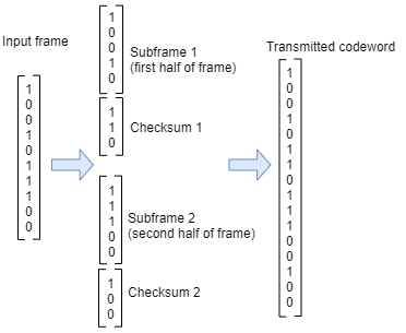 Входной кадр делится на два подкадра размера 5, и контрольные суммы размера 3 вычисляются и добавляются к каждому подкадру. Начальные состояния не показаны, поскольку начальное состояние [0] не влияет на выходные данные алгоритма CRC. Выходной передаваемый кадр кодового слова имеет размер 5 + 3 + 5 + 3 = 16.