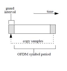 Аналогично концепции защитных полос, объект модулятора OFDM поддерживает защитные интервалы, которые обеспечивают временное разделение между символами OFDM, так что сигнал не теряет ортогональность из-за каналов с временным разделением. Пока защитный интервал больше, чем разброс задержки, каждый символ не создает помех другим символам. Защитные интервалы создаются с использованием циклических префиксов, в которых последняя часть символа OFDM копируется и вставляется как первая часть символа OFDM. Преимущество вставки циклического префикса сохраняется до тех пор, пока интервал временной дисперсии не превышает длительность циклического префикса. Объект модулятора OFDM позволяет установить длину циклического префикса. Недостатком использования циклического префикса является увеличение служебных данных.