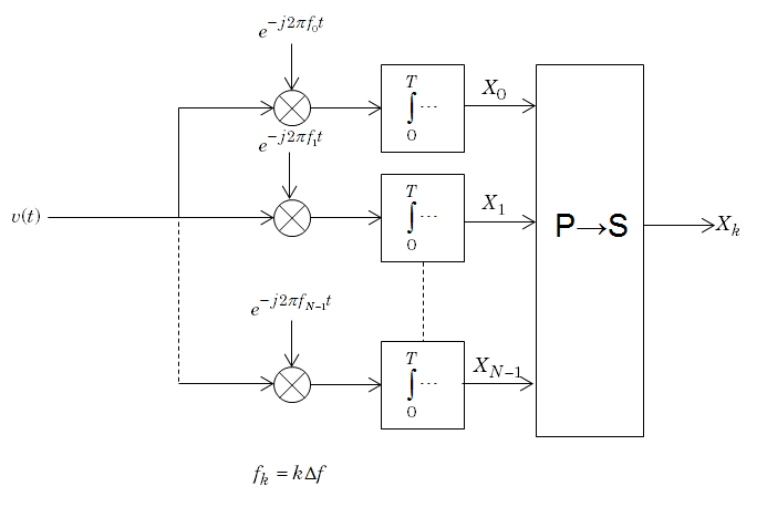 На рисунке показан демодулятор OFDM. Он состоит из набора N корреляторов с одним, назначенным каждой поднесущей OFDM с последующим параллельным преобразованием в последовательный.