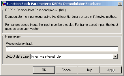 Блок основной полосы частот демодулятора DBPSK демодулирует сигнал, который был модулирован с использованием способа дифференциальной двоичной фазовой манипуляции. Вход является представлением модулированного сигнала в основной полосе частот.