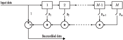 На каждом временном шаге ввод вызывает последовательное смещение содержимого регистров. С помощью параметра полинома Scramble можно задать состояние включения или выключения для каждого коммутатора дескремблера. Чтобы блок дескремблера изменил действие блока скремблера на противоположное, используйте одинаковые настройки параметров в обоих блоках. Если между скремблером и дескремблером нет задержки сигнала, то начальные состояния в двух блоках должны быть одинаковыми.