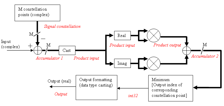 Общий блок основной полосы частот демодулятора QAM поддерживает операции с фиксированной точкой для вычисления жесткого решения (тип вывода установлен в Bit и для типа решения установлено значение Hard decision) и Approximate LLR (для параметра Output type установлено значение Bit и для типа решения установлено значение Approximate Log-Likelihood ratio) выходные значения. Входные значения должны иметь тип данных с фиксированной точкой для операций с фиксированной точкой.