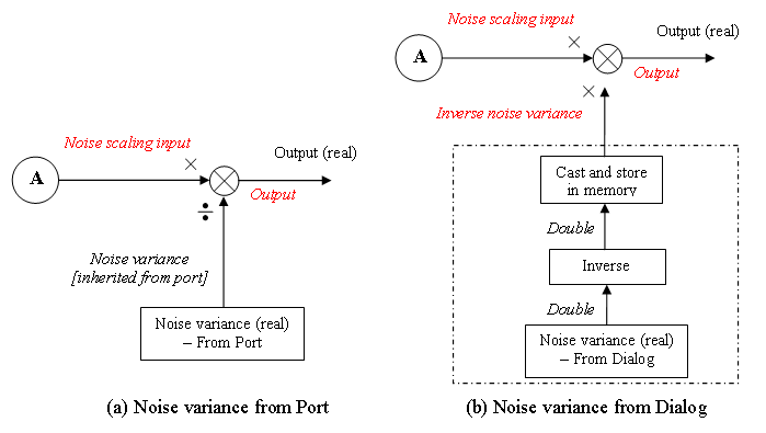 Если для параметра источника дисперсии шума задано значение Dialog, выходные данные являются результатом работы изделия, как показано на схеме последовательности операций сигналов режимов изменения шума и сигнала с фиксированной точкой для примерного режима LLR: режимов работы с отклонением шума. В этом случае оно следует внутреннему правилу для типов данных продукта, указанному в подразделе Inherit via Internal Rule Руководства пользователя DSP System Toolbox.