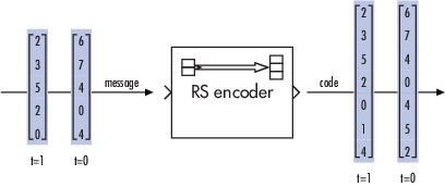Входные и выходные сигналы представляют собой целочисленные сигналы, представляющие сообщения и кодовые слова соответственно. Дополнительные сведения см. в разделе Длина входного и выходного сигнала в блоках RS.
