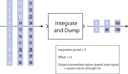Блок Integrate and Dump создает совокупную сумму дискретно-временного входного сигнала, сбрасывая сумму на ноль в соответствии с фиксированным графиком. Когда начинается моделирование, блок отбрасывает количество выборок, указанное в параметре «Смещение». После этого начального периода блок суммирует входной сигнал по столбцам и сбрасывает сумму до нуля каждые N входных выборок, где N - значение параметра периода интегрирования. Сброс происходит после того, как блок выдает свой выходной сигнал на этом временном шаге.