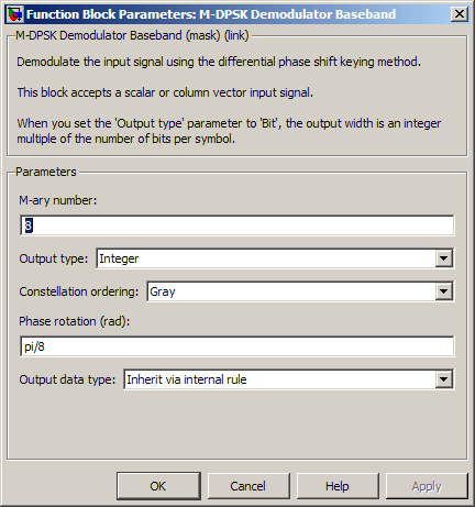 Блок М-ДФМ демодулятора основной полосы частот демодулирует сигнал, который был модулирован с использованием способа М-арной дифференциальной фазовой манипуляции. Вход является представлением модулированного сигнала в основной полосе частот. Вход и выход для этого блока являются дискретно-временными сигналами. Этот блок принимает входной сигнал скалярного значения или вектора столбца. Для получения информации о типах данных, поддерживаемых каждым блочным портом, см. таблицу Поддерживаемые типы данных на этой странице.